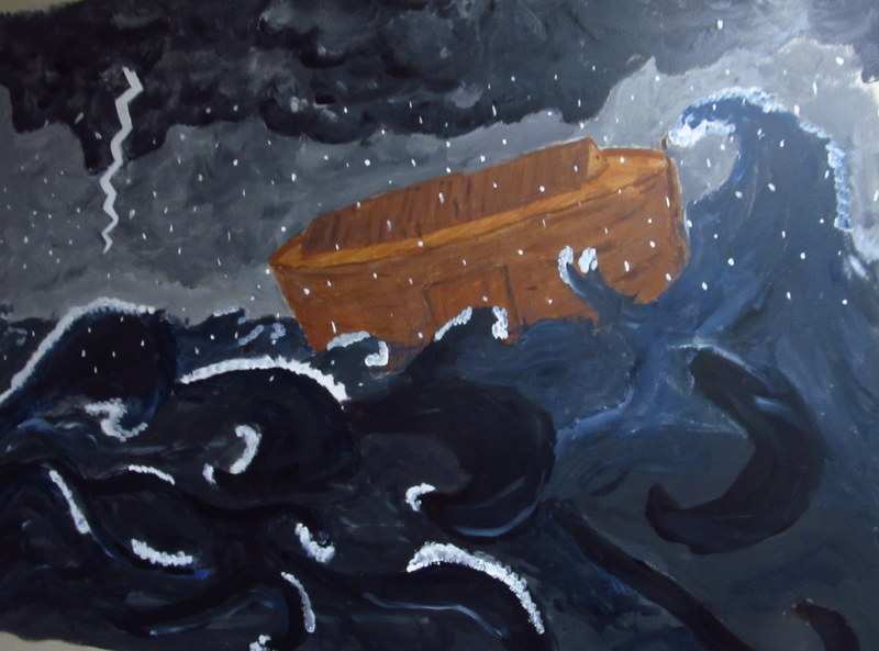 What exactly is my project, you might ask. Well, basically I am taking a hallway in the children’s section of my church, and I’m painting a series of murals on it that picture various important scenes from the Bible, like Noah’s Ark and David and Goliath. It’s going to be a timeline of sorts, and I’ve already got one and a half done. Here’s a picture of the first one: