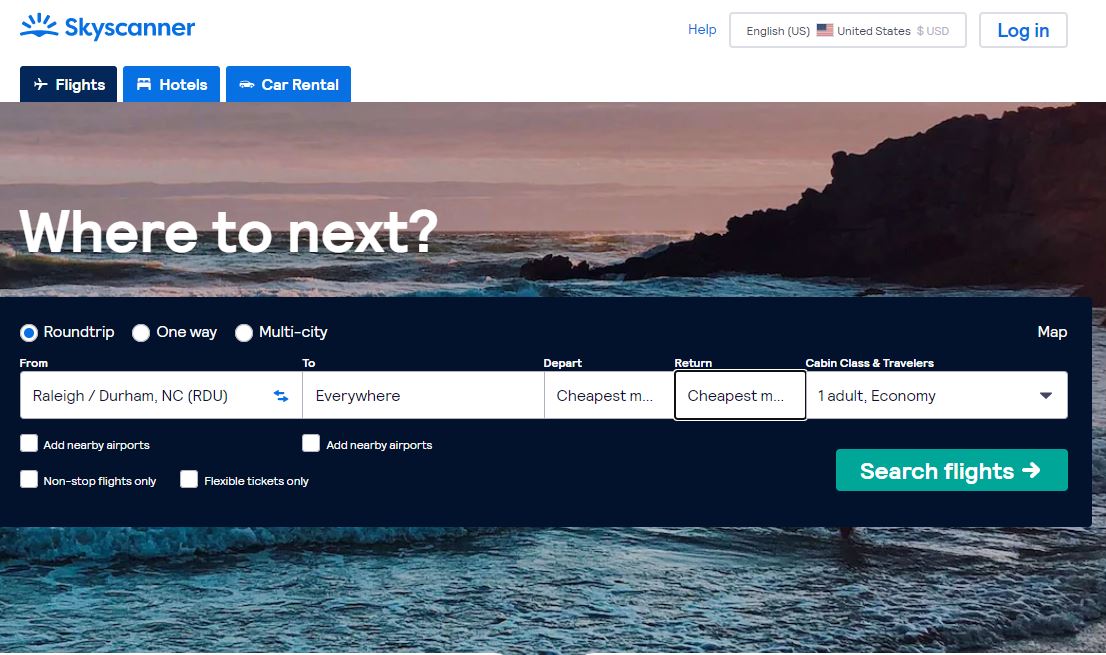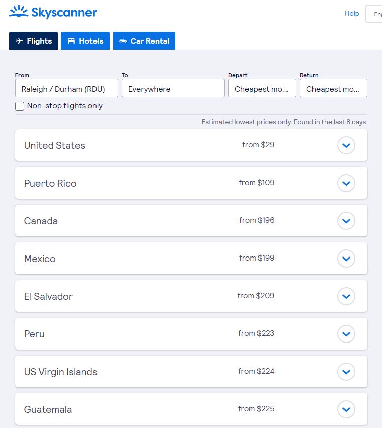 Skyscanner was hands-down the #1 site I visited to book all of my flights. The best thing about Skyscanner is that you don’t even need to know where you want to travel to, or even when you’re planning to travel (see screenshots below); their date selection bar allows you to simply search either for flights across an entire month, or even just the “cheapest month” to travel. Additionally, for the destination, you can search for flights to “everywhere” from your local airport!